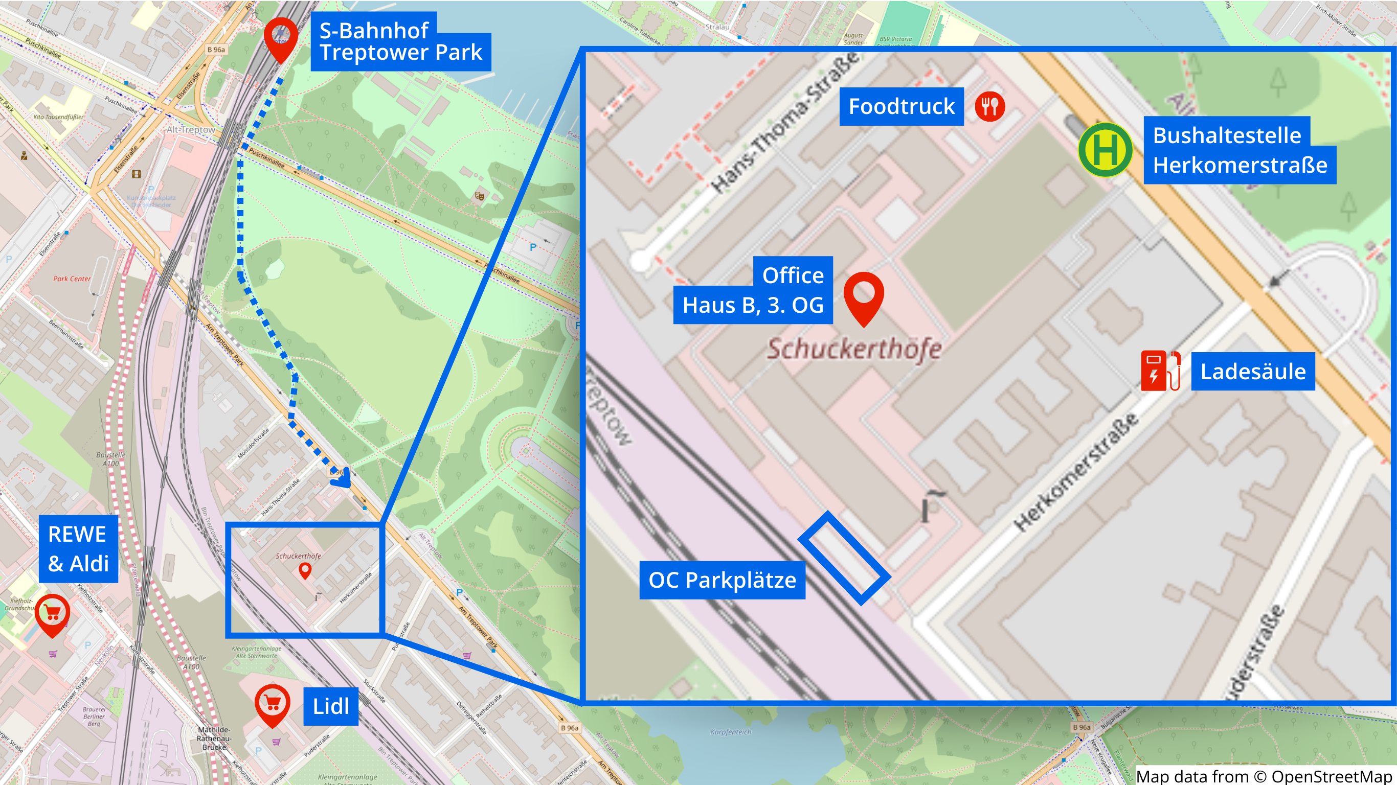 - Unser Office befindet sich etwa 10-15 Gehminuten entfernt.
